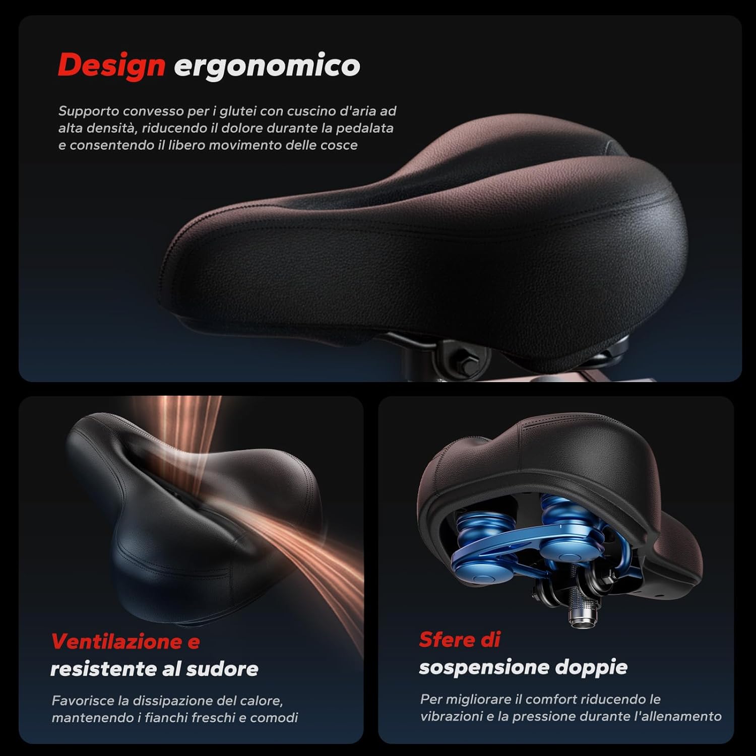 - [CYCLETTE ERGONOMICA E CONFORTEVOLE]: Dotata di schiuma ad alta densità e di un sistema di sospensione a doppia molla, questa cyclette riduce il disagio durante l’uso. I pedali in lega di alluminio offrono maggiore flessibilità, aderenza e sicurezza. Inoltre, il manubrio ergonomico avanzato assicura una presa confortevole per un allenamento efficace e senza distrazioni.