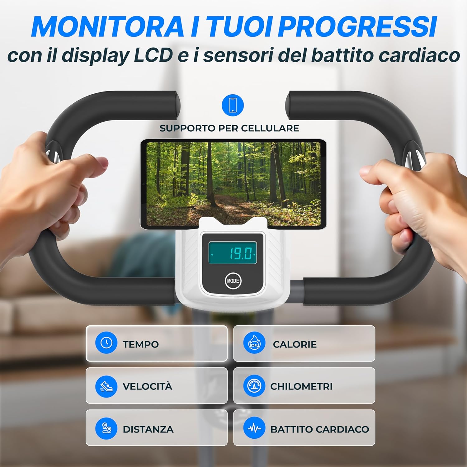 • EXTRA COMODA I La sella comfort ampia, imbottita e regolabile in altezza, insieme al manubrio alto con un grande display LCD e sensori di pulsazioni, offre una posizione ergonomica che protegge ginocchia e schiena, anche durante sessioni lunghe