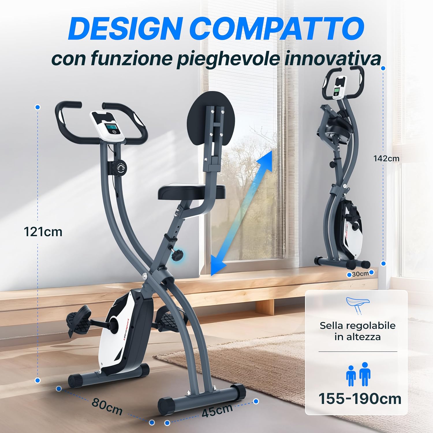 • COMPATTA E SILENZIOSA I Grazie al design compatto e alla funzione pieghevole, la cyclette per casa è adatti per piccoli appartamenti, il sistema di freno magnetico senza manutenzione garantisce movimenti fluidi e silenziosi